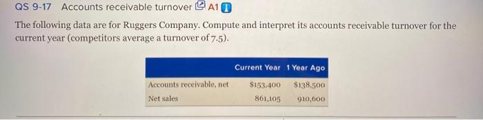 Compute and interpret its accounts receivable turnover for the current year competitors average a turnover of 75. ______________________________________ 2017 ____________ 2016 Accounts receivable net. Neer 4 uue 91220 QS 7-17 Accounts receivable turnover LO A1 The following data are for Ruggers Company.